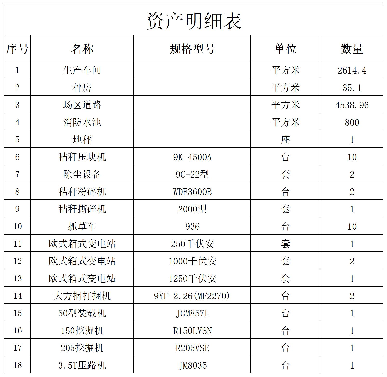 抚远市寒葱沟镇红卫村现有秸秆压块厂及配套设备设施和机械设备面向社会诚招租赁商。具体出租资产详见资产明细表。