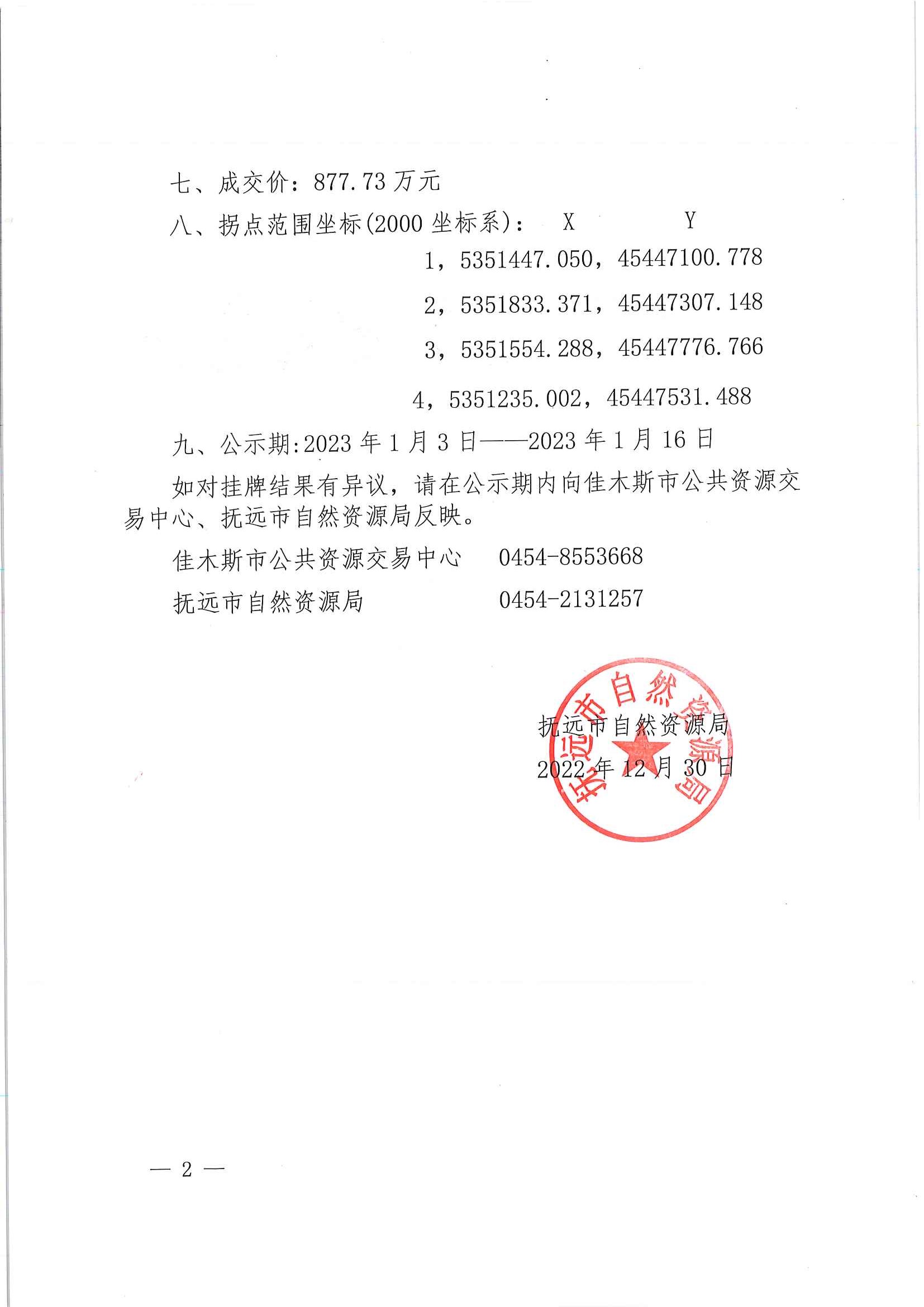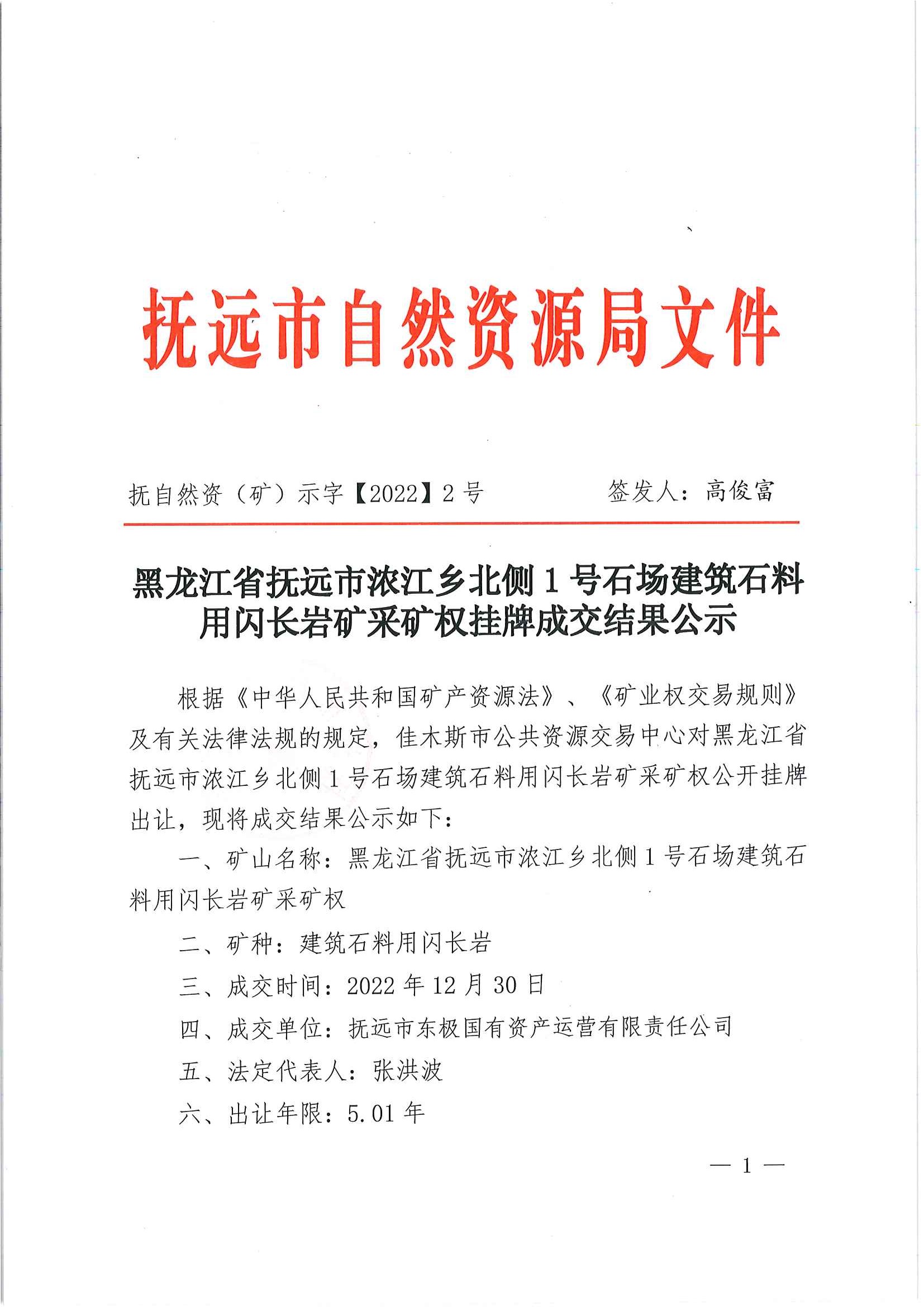 黑龙江省抚远市浓江乡北侧1号石场建筑石料用闪长岩矿采矿权挂牌成交结果公示