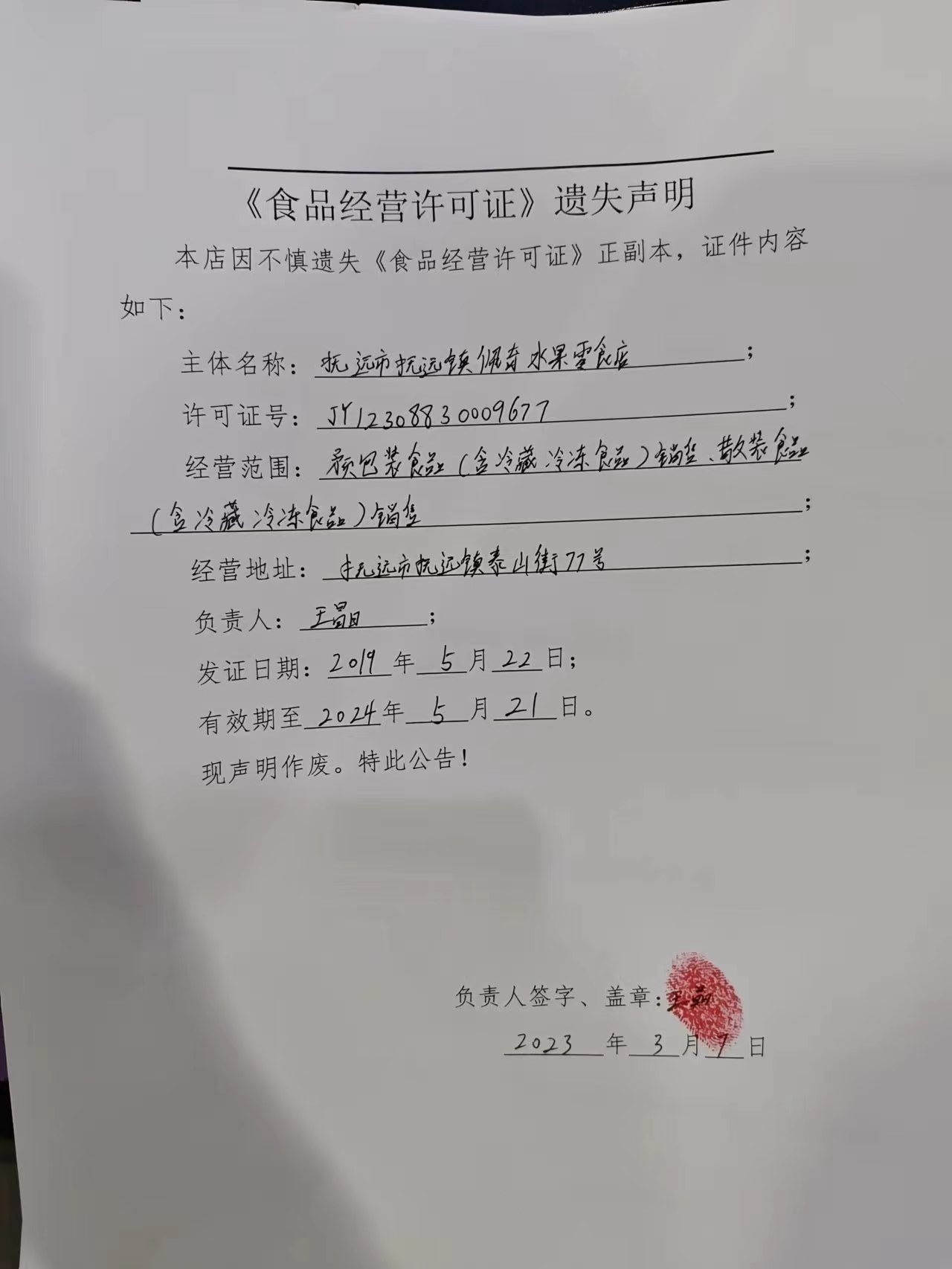 《食品经营许可证》遗失声明(2023.3.7)
