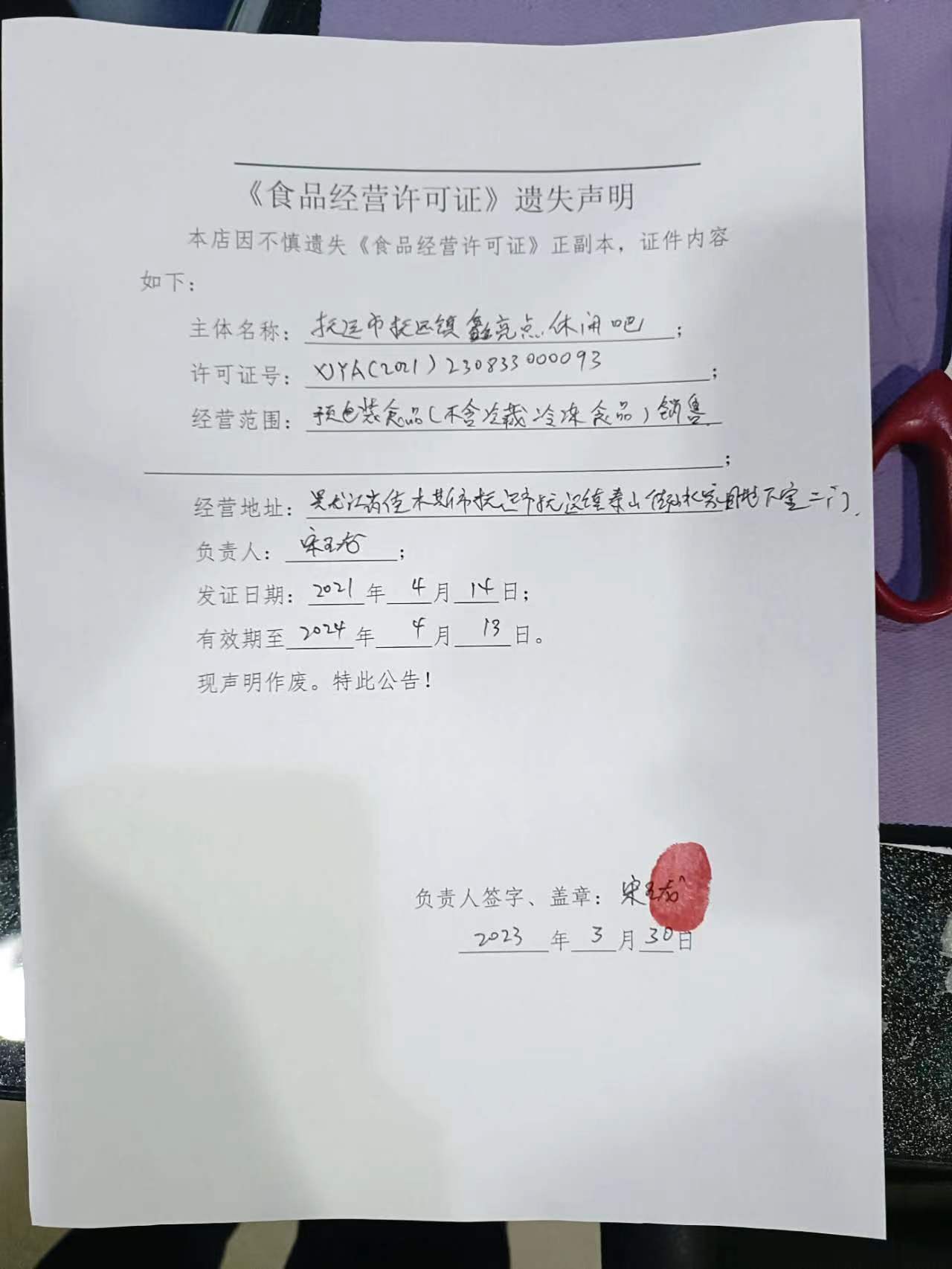 《食品经营许可证》遗失声明(2023.3.30)