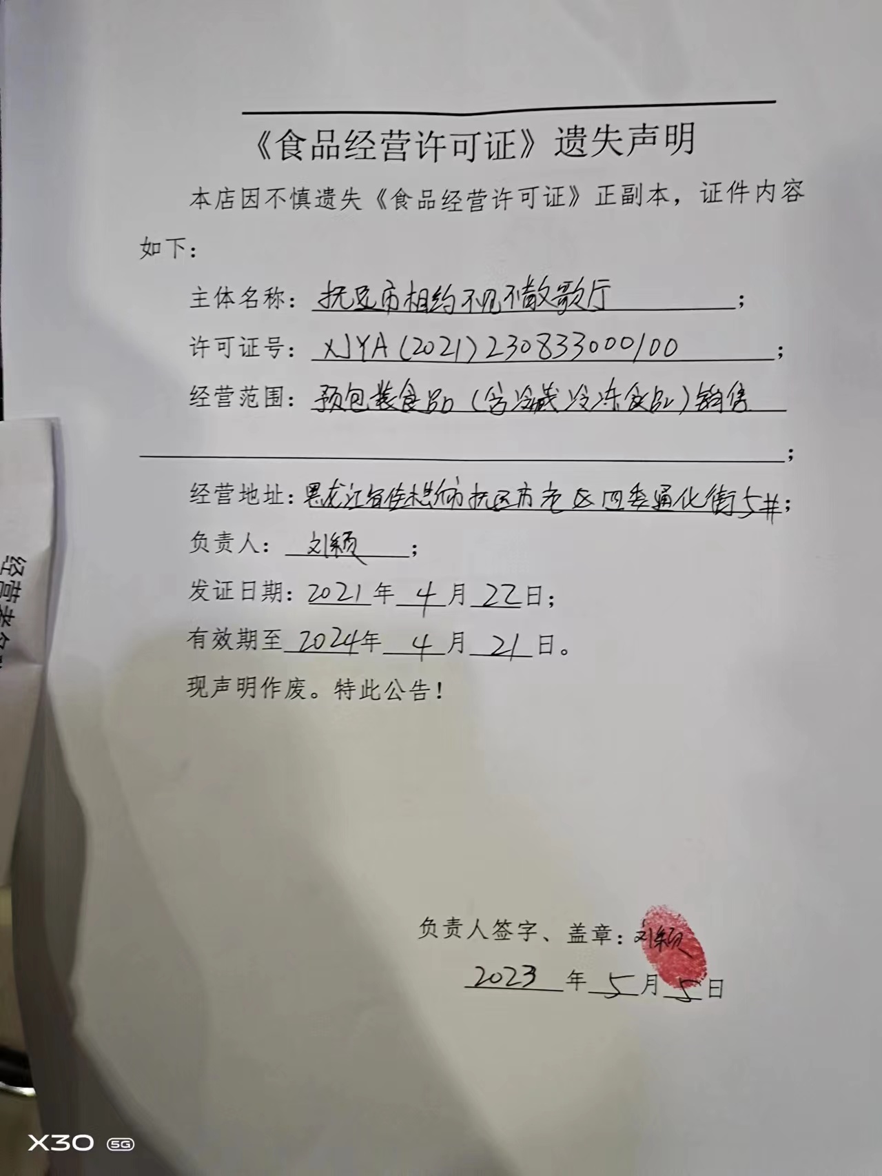 《食品经营许可证》遗失声明(2023.5.5)