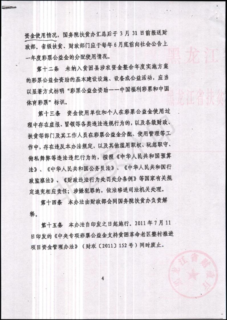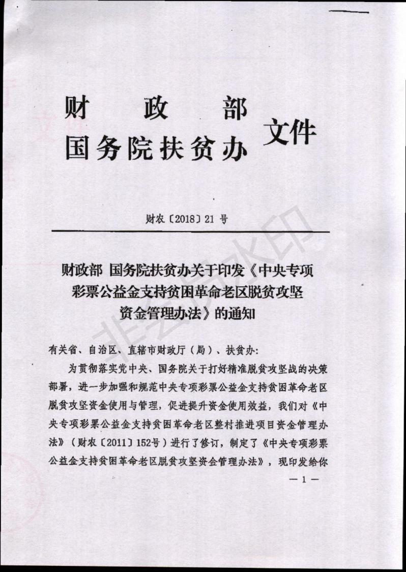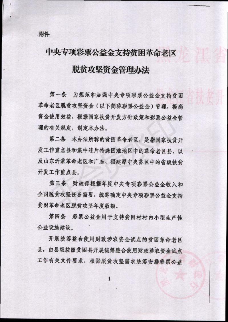 黑龙江省财政厅 黑龙江省扶贫办转发《中央专项彩票公益金支持贫困革命老区脱贫攻坚资金管理办法》的通知
