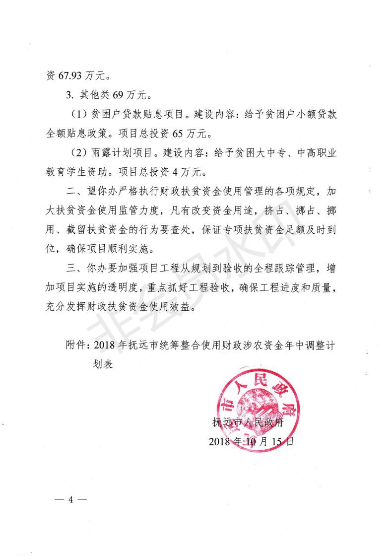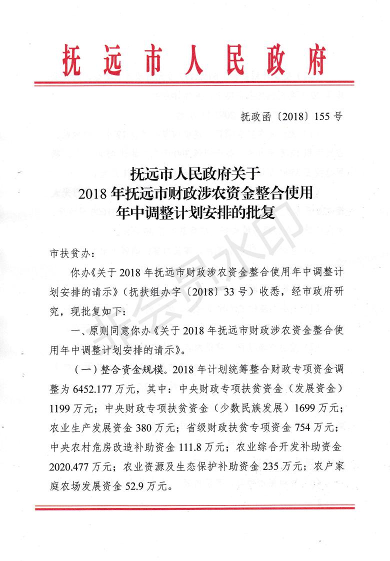 抚远市人民政府关于抚远市2018年抚远市财政涉农资金整合使用年中调整计划安排的批复